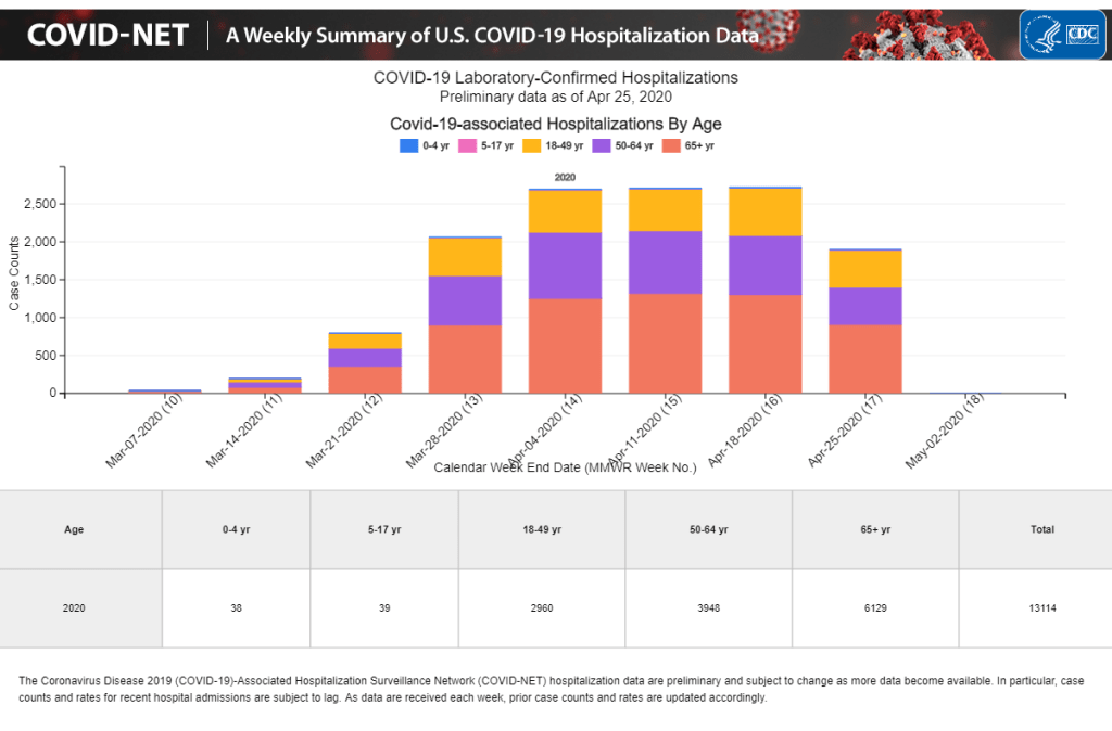 Because of my negative reaction, I think it will be useful to do some research to see what effect the lockdown is having. To start, I am curious about how locking down has prevented the spread of the disease to critical groups. Below is a graph of COVID related hospitilizations by age over the past 2 months (https://gis.cdc.gov/grasp/COVIDNet/COVID19_5.html):