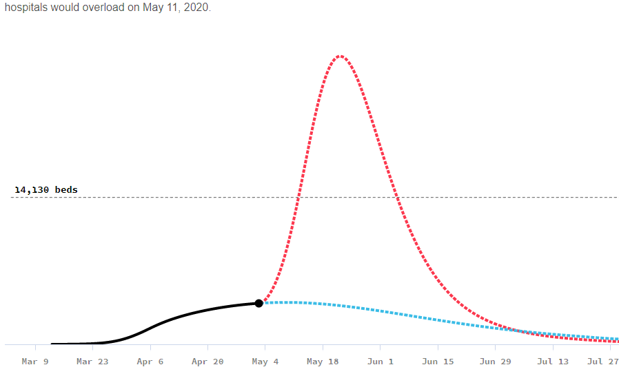 Regarding hospital overload, https://covidactnow.org/ contains a good aggregation of hospital resource data. Using MA as an example, we can see the projection is all hospital resources will be used by May 11 if all restrictions are removed.